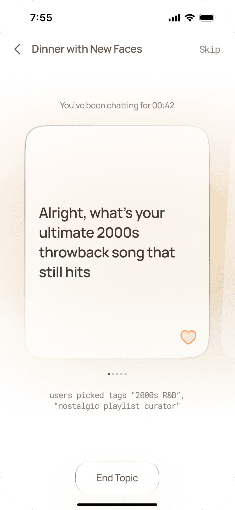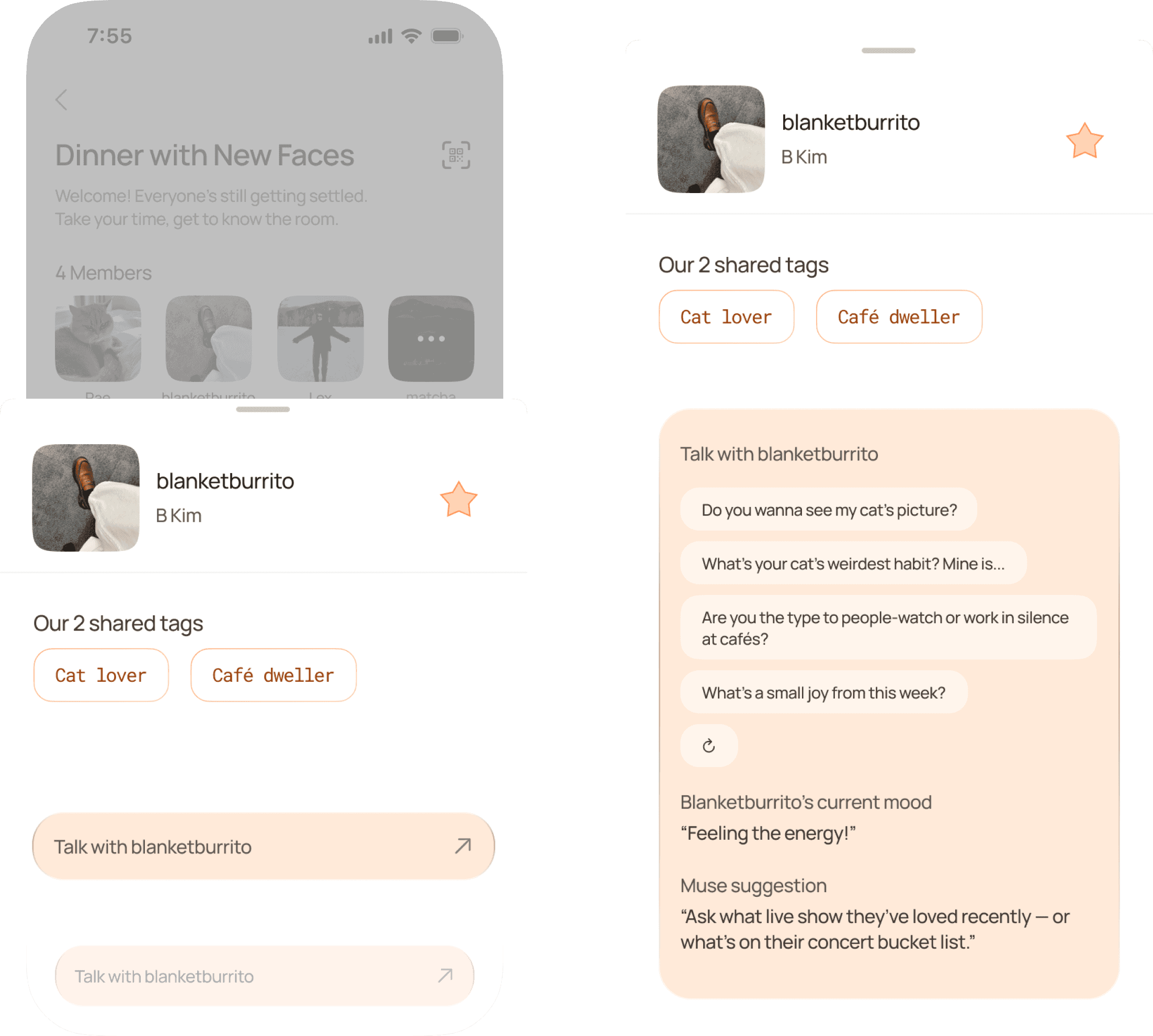 This inspired Muse’s gentle 1:1 conversation assist based on shared vibes and tags.