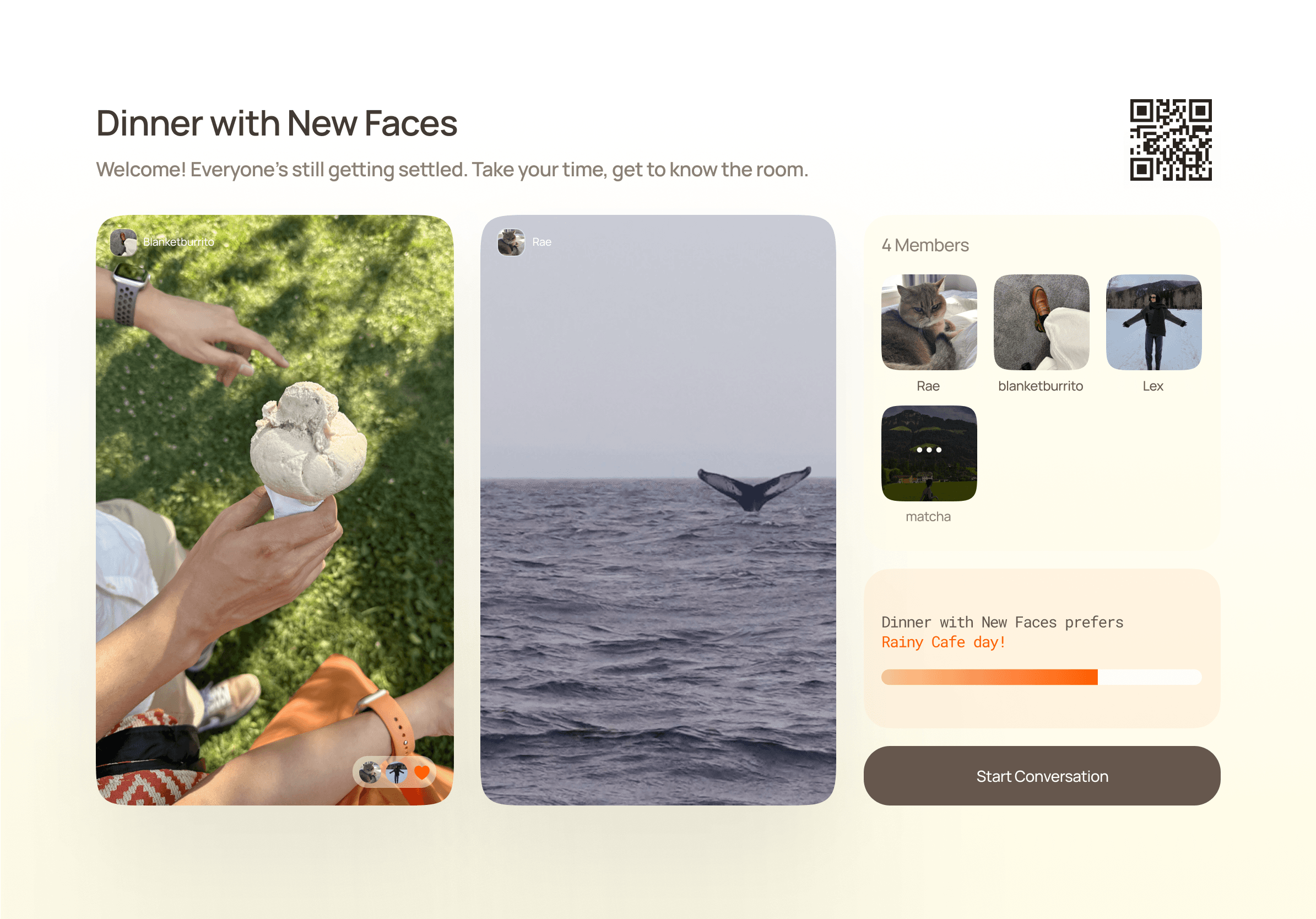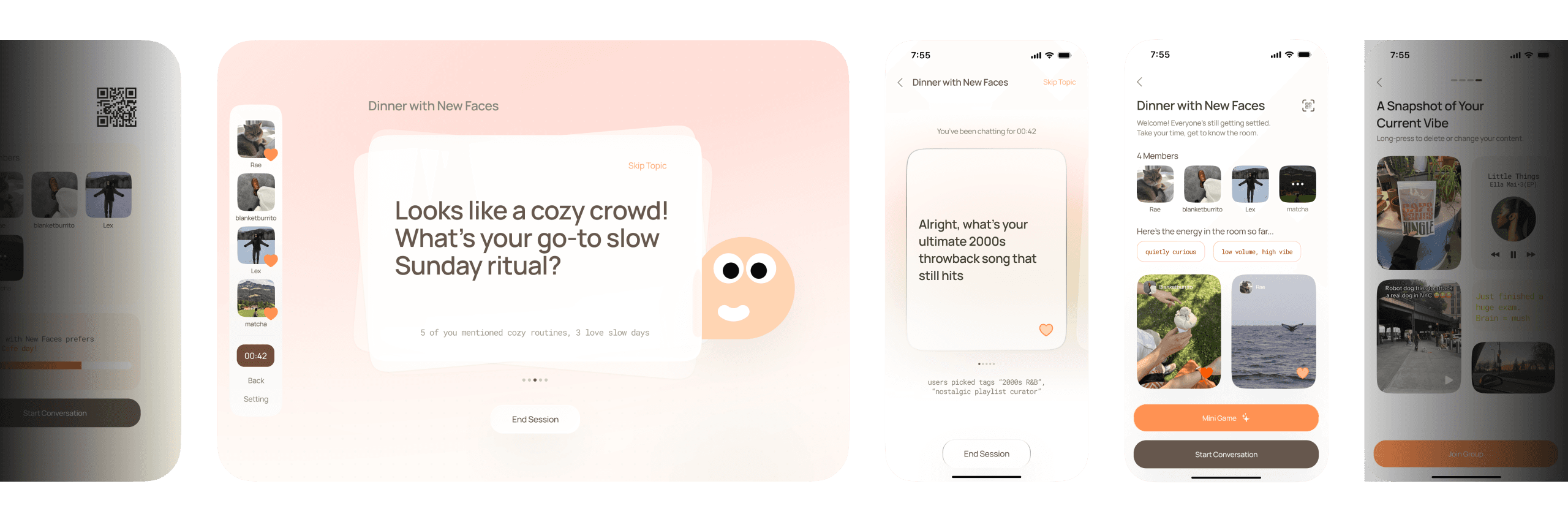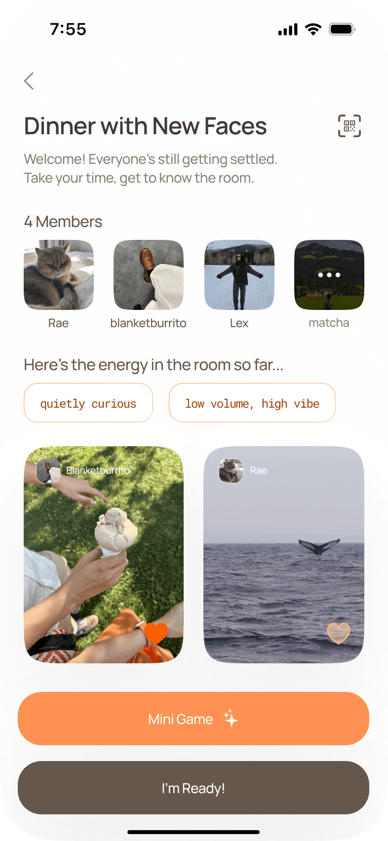 To make socializing less awkward and more intuitive, I designed a group-first experience to help semi-strangers ease into connection by finding emotional common ground without pressure.