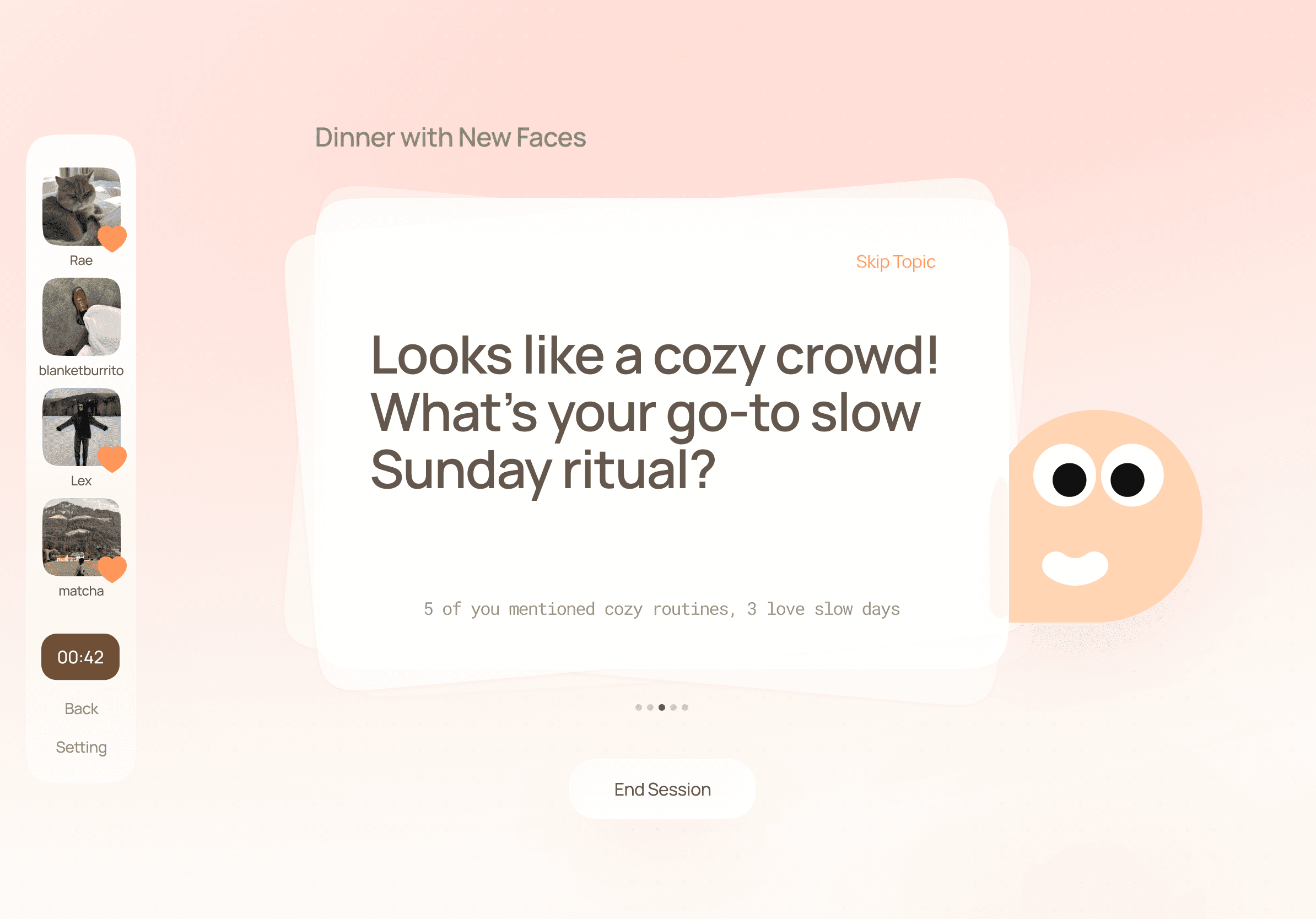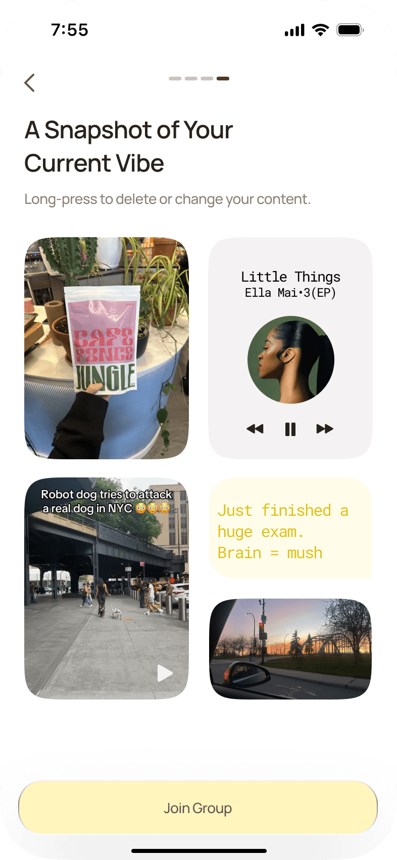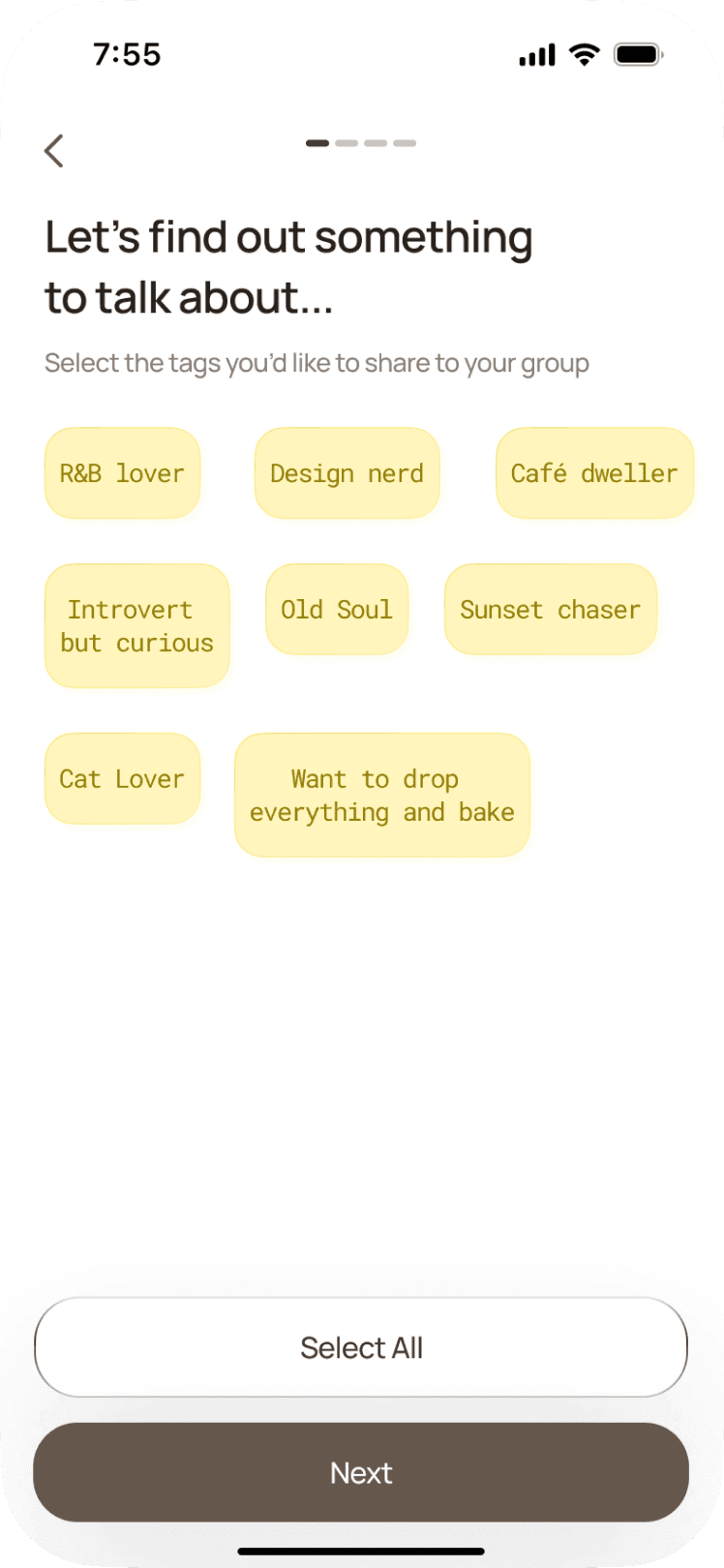 To make socializing less awkward and more intuitive, I designed a group-first experience to help semi-strangers ease into connection by finding emotional common ground without pressure.
