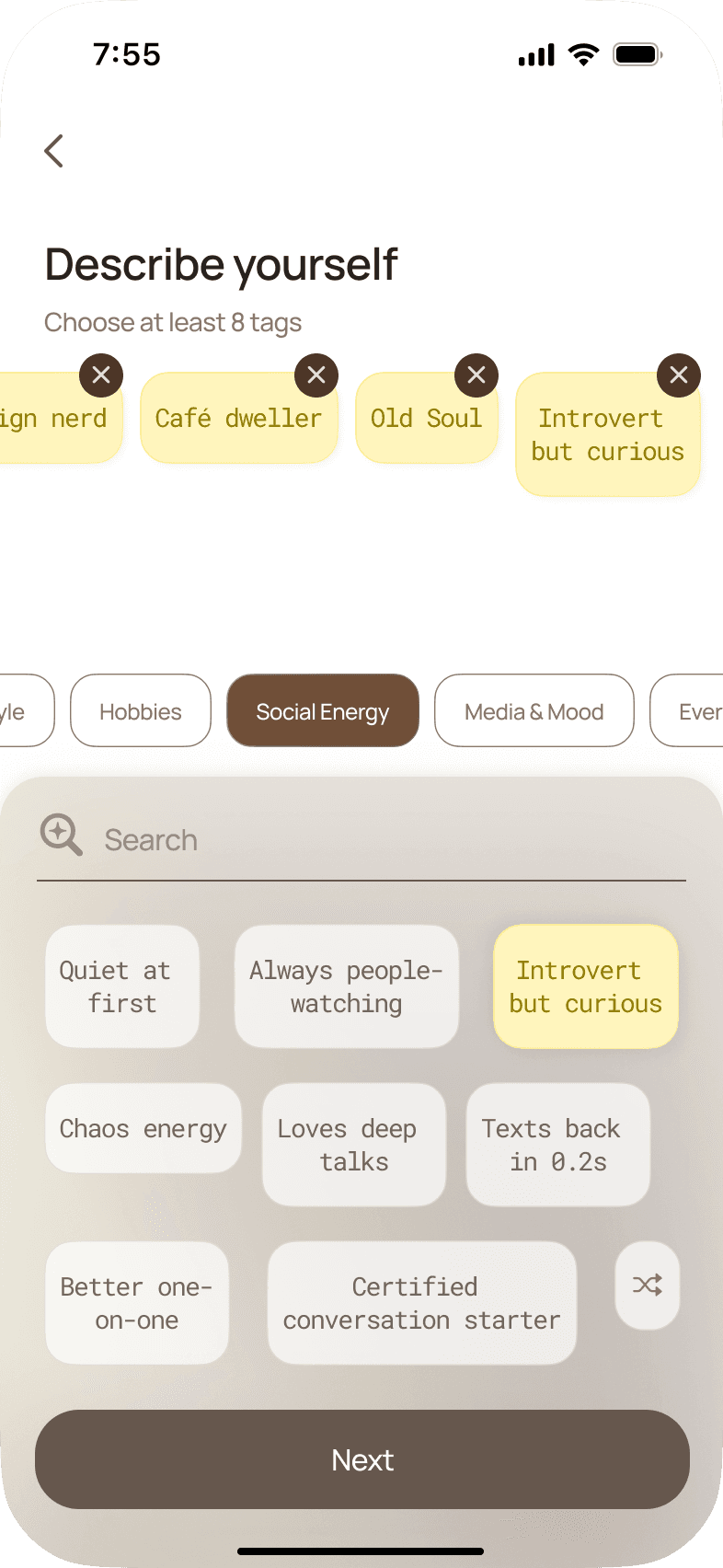 I created a low-pressure space where users can explore someone’s current vibe and shared tags. It also helps spark 1:1 chats by gently suggesting casual conversation starters based on tone, context, and mutual curiosity.